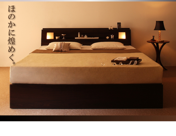 棚、モダンライト、コンセント付きのヘッドボード、ヘッドボード両側面に用途に応じた使い方可能な収納を用意!