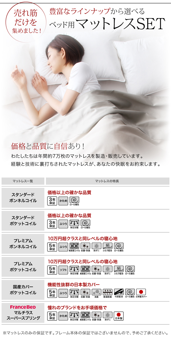 | フレームのみ | スタンダードボンネルコイルマットレス付き | スタンダードポケットコイルマットレス付き | プレミアムボンネルコイルマットレス付き | プレミアムポケットコイルマットレス付き | 国産カバーポケットコイルマットレス付き | マルチラススーパースプリングマットレス付き | |