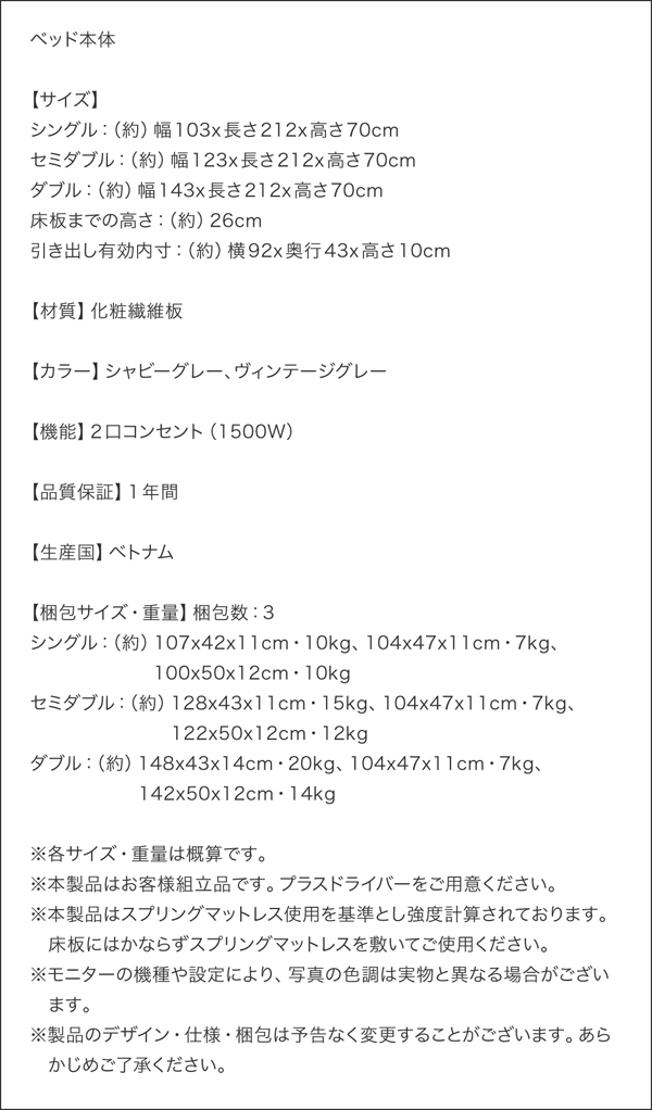 コンセント付きのヘッドボード。2杯の引き出し収納。シンプルデザインベッド。選べる2カラー×3サイズ。