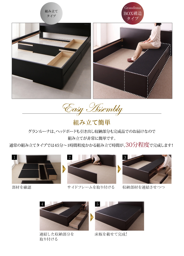 グランルーナは、高級感ある、つや感際立つウレタン塗装仕上げ。傷や汚れにも強く、長くお使いいただくことを前提にしている、収納ベッドです。