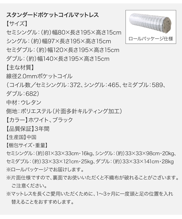 | フレームのみ | スタンダードボンネルコイルマットレス付き | スタンダードポケットコイルマットレス付き | プレミアムボンネルコイルマットレス付き | プレミアムポケットコイルマットレス付き | 国産カバーポケットコイルマットレス付き | |