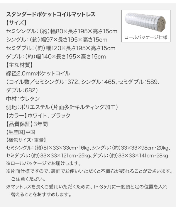 | フレームのみ | スタンダードスタンダードボンネルコイルマットレス付き | スタンダードポケットコイルマットレス付き | プレミアムボンネルコイルマットレス付き | プレミアムポケットコイルマットレス付き | 国産カバーポケットコイルマットレス付き | |