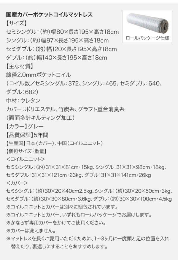 | フレームのみ | スタンダードボンネルコイルマットレス付き | スタンダードポケットコイルマットレス付き | プレミアムボンネルコイルマットレス付き | プレミアムポケットコイルマットレス付き | 国産カバーポケットコイルマットレス付き | |