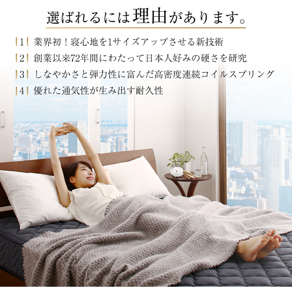 しなやかさと弾力性に富んだ、高密度連続コイルスプリングが、寝返りをサポートする仕様になり、自然な寝返りが睡眠の質を高めます。