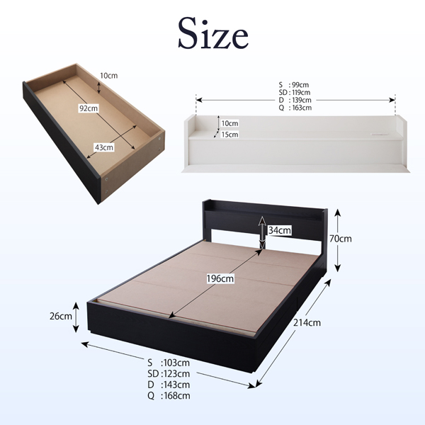 コンセント付きのヘッドボード。2杯の引き出し収納。高級感のあるモノトーン。選べる2カラー×4サイズ。