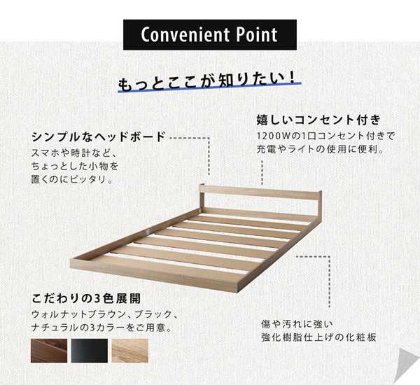 ヘッドボードはスッキリとした印象を与えるシンプルなデザインに、1口コンセントが付いています!