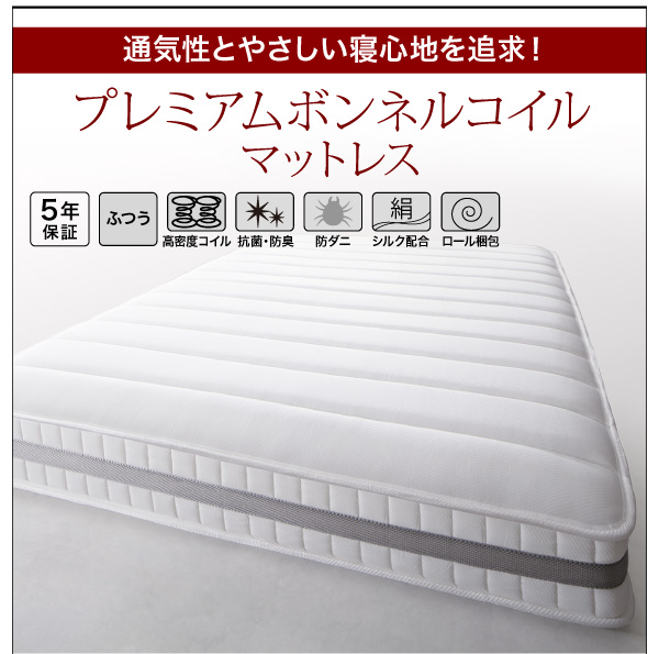 | フレームのみ | スタンダードボンネルコイルマットレス付き | スタンダードポケットコイルマットレス付き | プレミアムボンネルコイルマットレス付き | プレミアムポケットコイルマットレス付き | 国産カバーポケットコイルマットレス付き | マルチラススーパースプリングマットレス付き | |