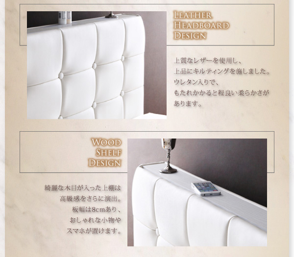 上質なレザーを使用し、ウレタン入りキルティングを施したヘッドボードには、綺麗な木目が入った上棚付き。