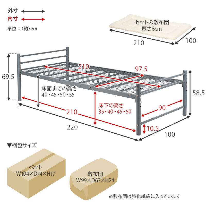 快適ベッド生活 > パイプベッド > シングルベッド > スリムフィット > スチール ロング ベッド+敷布団 2点セット シングル