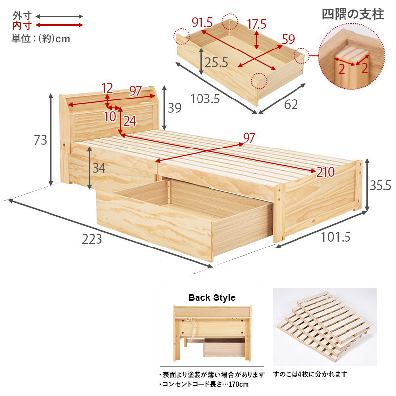 棚・コンセント・引き出し付き 布団が使える 天然木すのこベッド ロングサイズ フレームのみ シングル