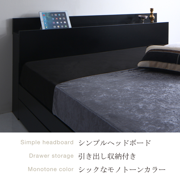 コンセント2個付きのヘッドボード、ベッド下に2杯の引き出しでスッキリ収納。引き出しは左右の入替が可能、お部屋のレイアウトに合わせられます。