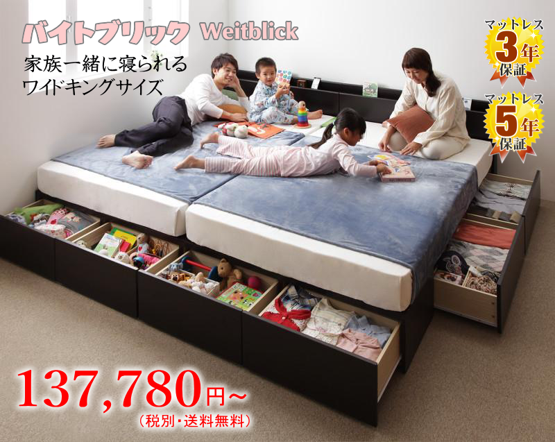 連結して家族一緒に寝られる収納ベッドです。連結最大幅は240cm。