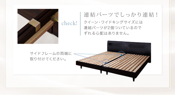 定番のダブルサイズの他、クイーンサイズ(セミシングル2台構成)、ワイドキング(シングル2台構成)では、連結金具が同梱されています。